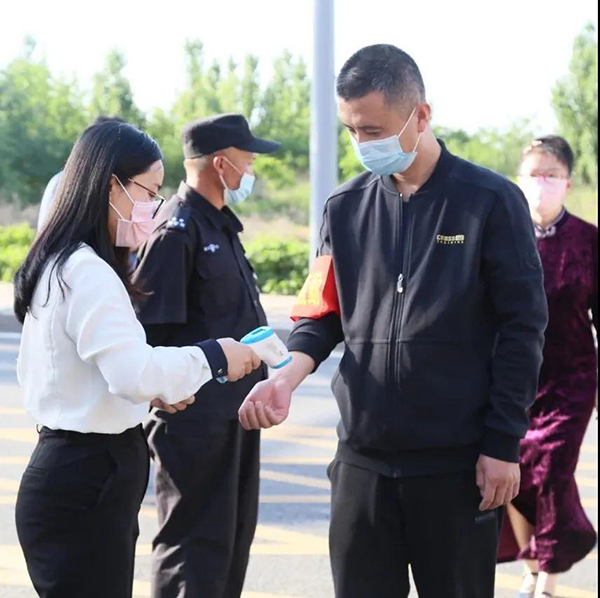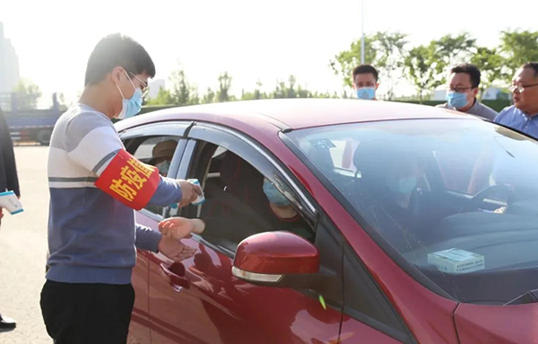 教师驾车到达学校门口,在值班人员的指挥下,“学生”们间隔一米有序测温入校。