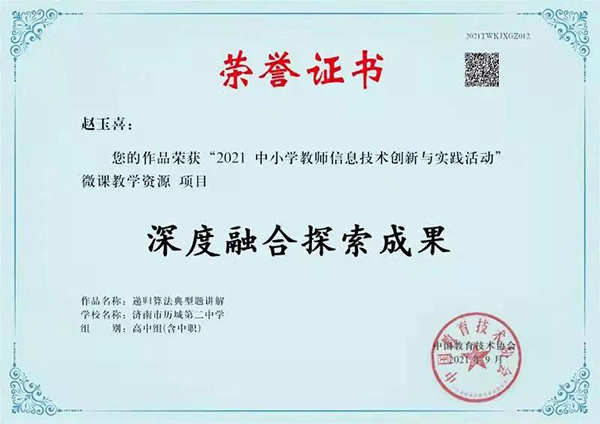 赵玉喜老师将信息编程教学与微课教学有机融合,探索信息化资源创新和使用的常态化、个性化、智能化,既促进自身专业素养的提升,又培养学生养成数字化学习环境下终身学习的良好习惯。自今年5月到11月,参与申报的三节微课经过公示、展评、答辩等环节均获全国奖。2021年5月“教科杯”微课《函数的设计与使用》全国一等奖,2021年9月微课《递归算法典型题讲解》获“深度融合探索成果”奖,2021年11月教育部数字化微课《折纸赛珠峰》全国一等奖。