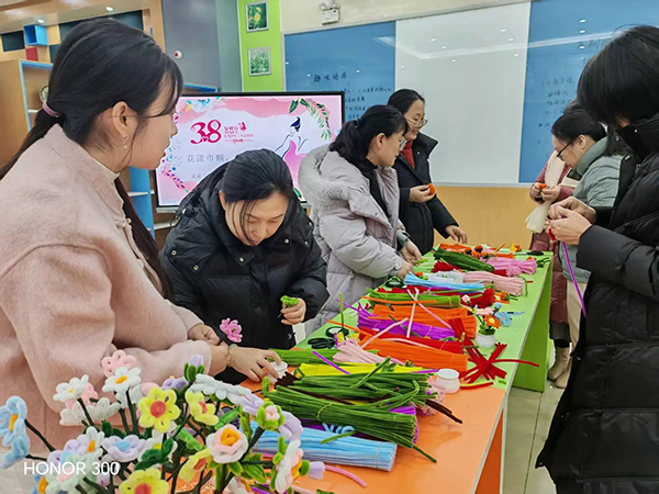 为丰富节日体验,学校还特意安排了"花漾巾帼 艺趣时光"手作体验环节。在“三八”节前一周,学校工会与心理健康中心共同举办了“扭扭棒花艺DIY”活动。活动现场配备专业指导,女教师们通过彩色扭扭棒制作个性化花艺作品,让创意在指尖绽放。从基础的花型设计到创意无限的组合搭配,女教师们纷纷发挥想象力,用五彩斑斓的扭扭棒编织出一件件独一无二的花艺作品。