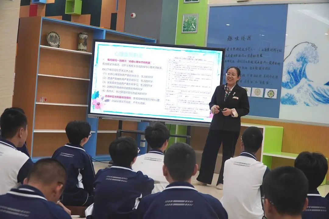 在培训中,祝增莉老师首先带领同学做了“桃花朵朵开”的热身活动,活跃气氛,迅速拉近了同学之间的距离。接下来,祝老师从“世界精神卫生日”的由来谈起,为同学们普及青少年心理健康的标准和重要性,以及常见心理困扰的区分。最后,祝老师重点阐述了班级心理委员的职责。班级心理委员作为班级中的心理健康守护者,肩负着观察同学心理动态、及时发现问题、提供初步心理支持和引导同学寻求专业帮助等重要任务。他们要做同学们的知心朋友,关注班级同学的情绪变化,积极倾听同学们的心声,为同学们提供一个可以倾诉和释放压力的渠道。
