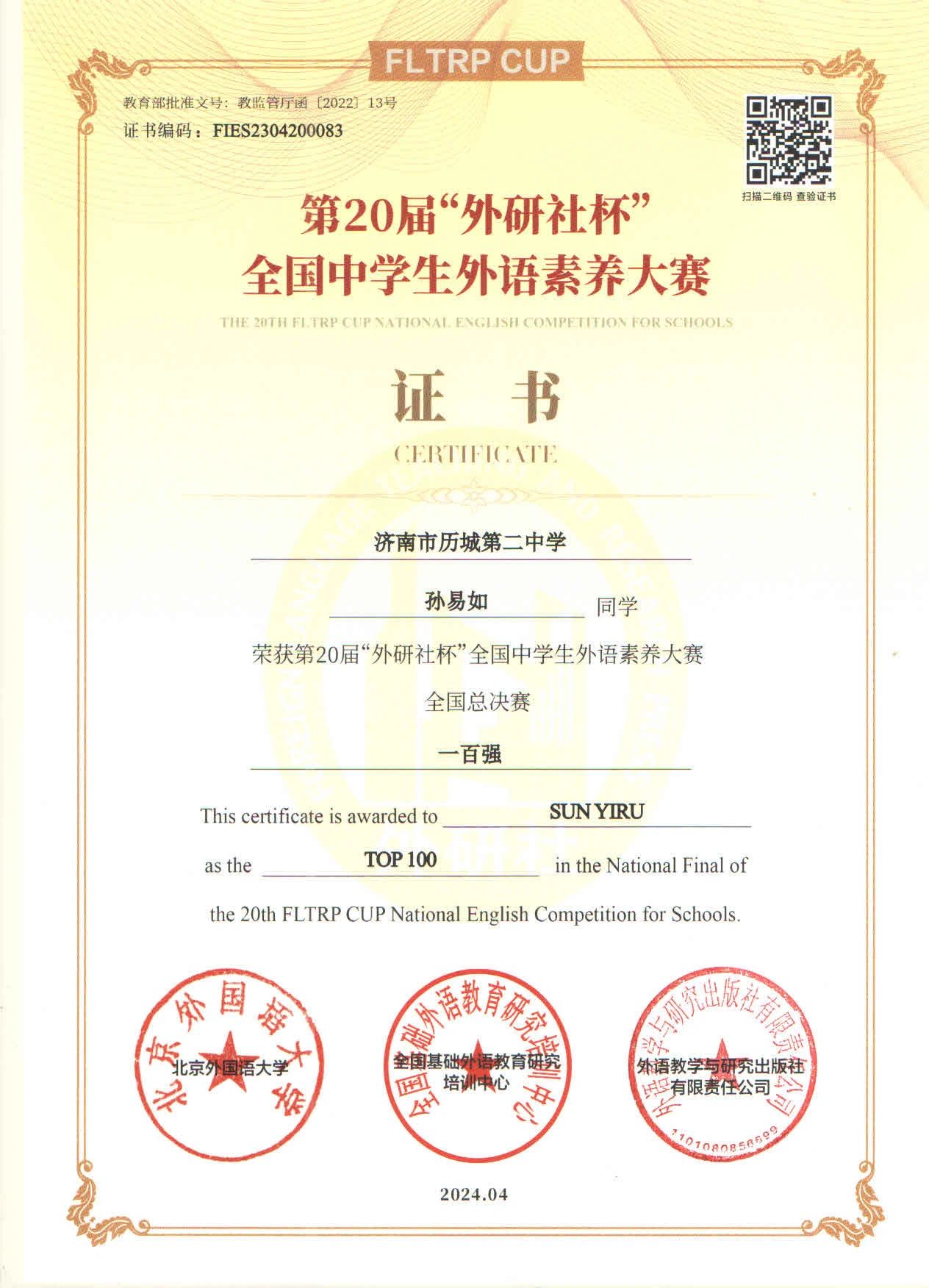 在第20届“外研社杯”全国中学生外语素养大赛中,历城二中学子喜获佳绩!学校获评“优秀组织奖”,226人获省级以上荣誉,其中,高二7班孙易如更是在全国近百万名参赛选手中脱颖而出,成为济南市晋级决赛的四位选手之一,成功晋级全国百强。