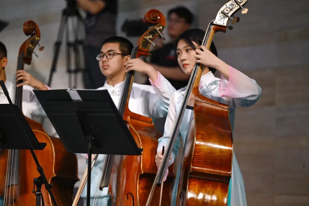 在历城二中国乐团表演的中国管弦乐《春华秋实》中,“博物馆之夜”正式开启。现场,历城二中国乐团先后带来了精彩管弦乐《春华秋实》《印象国乐》《延河随想》《茉莉花》,舞蹈团带来了美轮美奂的舞蹈《黄河》,合唱团则带来了《The Water Dance Of LLUVIA》《哭泣的草原》《雪花》《观沧海》等曲目的合唱。山东博物馆与历城二中馆校合作课程展示——知书达礼“华服秀”《衣冠大成》、历城二中艺术团教师的四重唱歌曲《我爱你中国》以及济南稼轩学校小学部舞蹈团表演的《京韵戏妞》,更是将活动推向了一个个高潮。