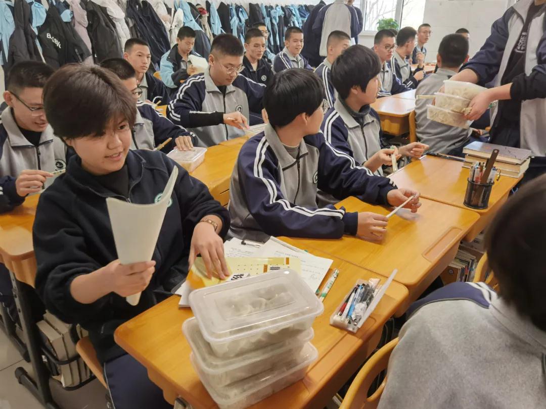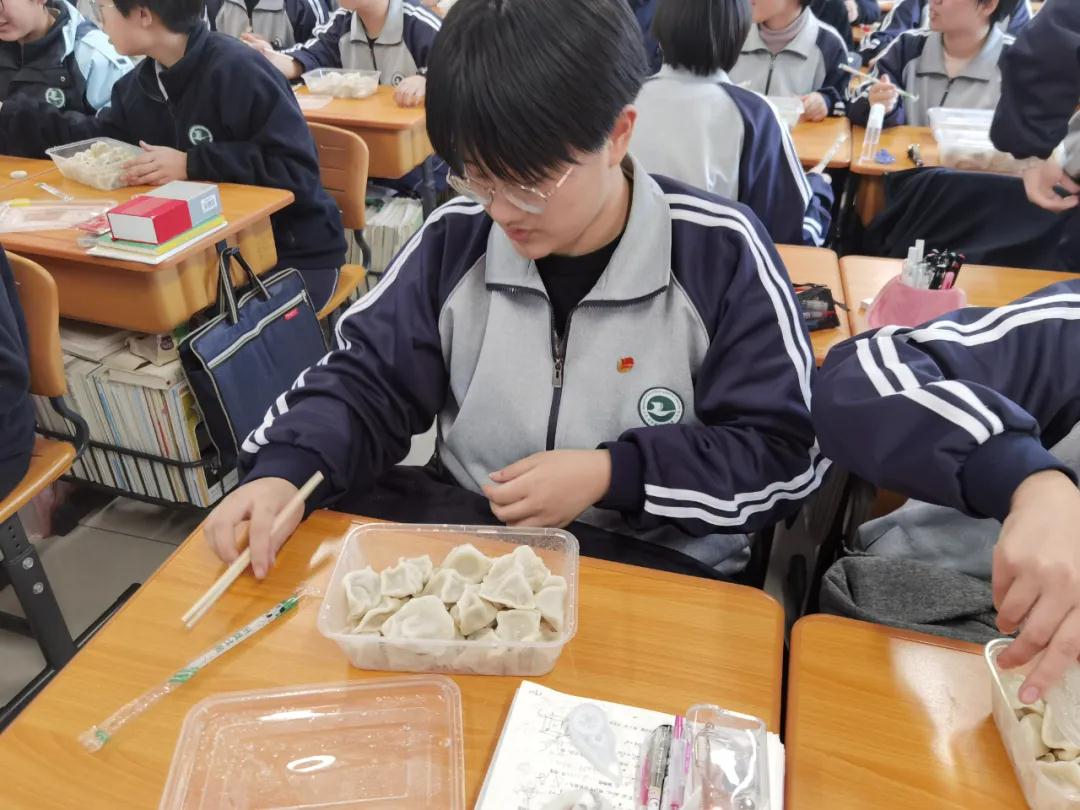 随后便是包饺子、吃饺子。走进高二二十九班,全体同学在班主任魏恒老师的带领下,在教室里包饺子庆祝冬至节;高二十六班全体同学在班主任徐浩老师的带领下,认真学习了与冬至有关的文化习俗,便开始大快朵颐。