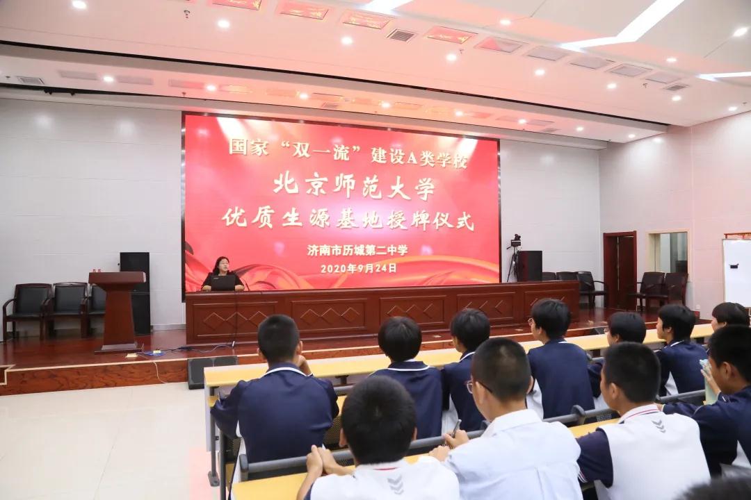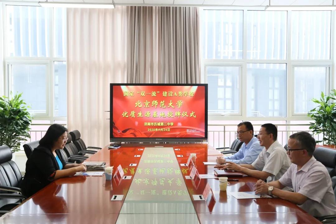 9月24日下午,北京师范大学优质生源基地授牌仪式在历城二中日新楼举行。北京师范大学管理学院副教授、副院长果佳博士来到我校,与学校副校长李矿水等领导进行了交流座谈。在2020年高考中,于晗、张荣俊、赵旭和孙博闻四位同学考入北京师范大学。