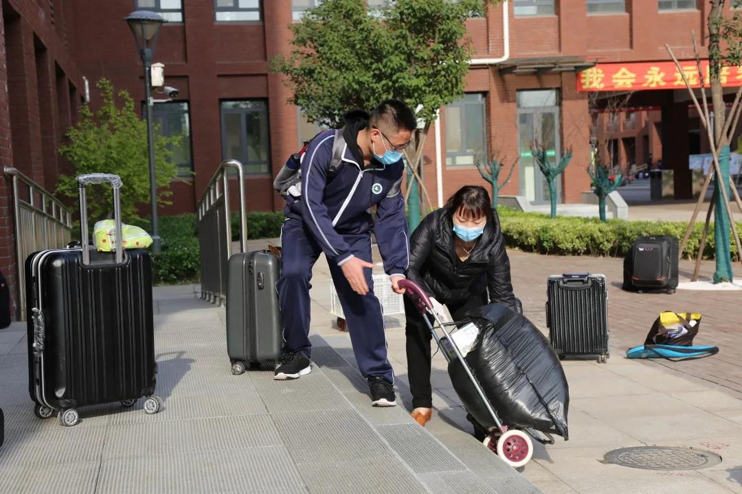 根据4月9日召开的高三线上家长会的要求,家长将车辆开到校门口后,放下孩子和行李驶离。学生带着健康卡在校门口复测体温,复测合格有序进入学校。