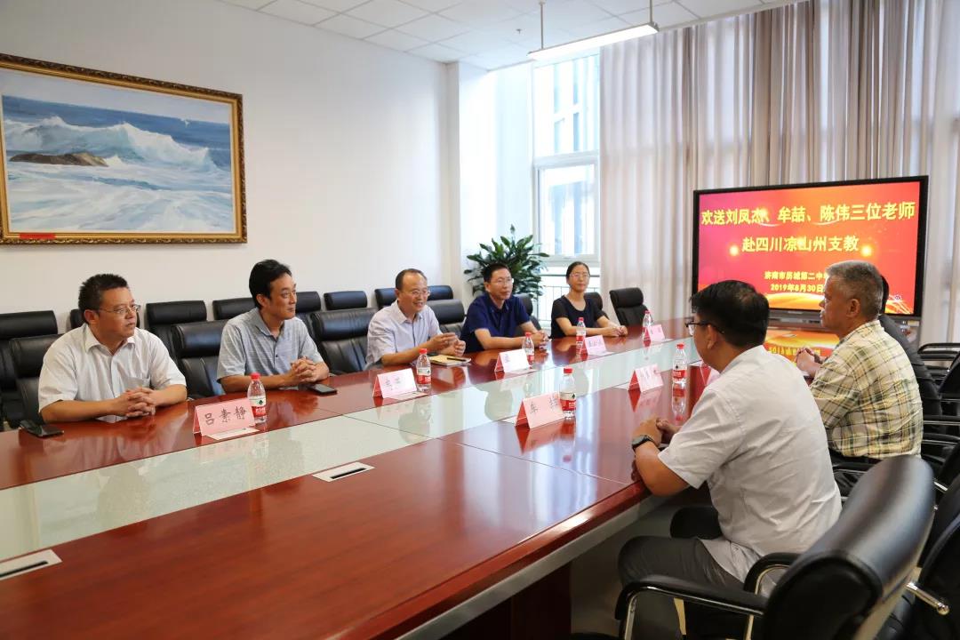 历城二中党委书记、校长李新生出席会议,他首先介绍了开展四川凉山州支教帮扶活动的背景和意义。四川凉山州是全国最大的彝族聚集区,是全国十四个集中连片特困地区之一,是“三区三州”典型的深度贫困地区。2018年,习近平总书记深入凉山州腹地考察脱贫攻坚,同当地干部群众共商精准脱贫之策。2019年,孙春兰副总理、胡春华副总理前往凉山州调研脱贫攻坚工作,对“两不愁三保障”等突出问题作出重要指示。为贯彻落实中央领导指示精神,确保“义务教育有保障”,教育部提出持续三年为凉山地区提供1600名教师支持计划。本次支教选派工作信息发布后,老师们积极响应号召,踊跃报名。学校经过综合研究考量,最终决定选派刘凤杰、牟喆、陈伟三位老师赴四川凉山州支教。李校长充分肯定了赴凉山州支教老师的大局意识和奉献精神,感谢他们能够积极参加支教工作。李校长希望三位老师可以尽快适应,认真做好支教工作,发挥各自优势,将来自“孔孟之乡”齐鲁大地的优质教育和先进理念带到贫困地区,给支教学校带去温暖。李校长表示,学校作为老师们的坚强后盾,定会全力做好各方面的服务保障工作,为三位老师解除后顾之忧。三位老师纷纷表示,经历就是财富,此次支教是一次难得的学习锻炼机会,他们一定牢记嘱托,不负使命,积极配合当地老师,搞好民族团结,圆满完成支教任务。
