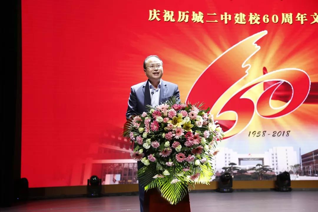 在大家的掌声中,历城区教育局副局长、历城二中党委书记、校长李新生发表校庆致辞。李校长代表学校感恩为学校发展呕心沥血的老领导、老前辈,感恩每一位对母校关怀热爱的校友,感恩对学校鼎力支持的家长朋友,感恩正在这片热土上辛勤工作、无私奉献的每一位教职员工,感恩为新校区的建设付出汗水的建设者们,感恩胸怀远大理想而孜孜追求的可爱的学生们。李校长与大家共同回顾了建校六十年来走过的风雨历程,几代二中人承载着责任与使命,把一所只有8个教学班,31名教职工的乡村初中发展成为享誉齐鲁大地、在全国有一定知名度的品牌名校。李校长与大家分享了近年来学校取得的办学成果,并表示有信心团结带领大家,在新的历史起点上,肩负起名校使命担当,为社会提供更优质的教育资源,努力把唐冶新区打造成全市乃至全省的教育高地。
