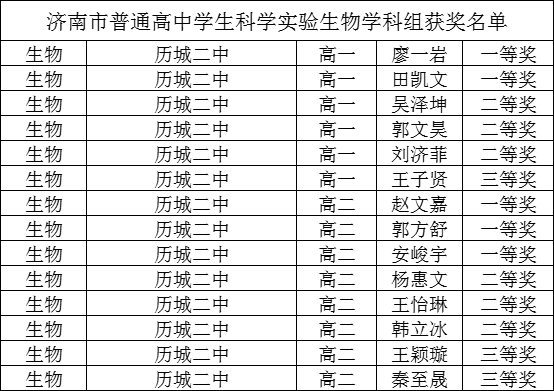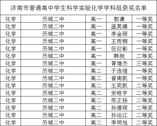 近日,济南市教育教学研究院公布济南市普通高中学生科学实验比赛结果,济南市历城第二中学喜得佳绩,45位同学在物理、生物、化学学科组实验中分获一、二、三等奖。其中,物理学科组有16人获奖,化学学科组有15人获奖,生物学科组有14人获奖。