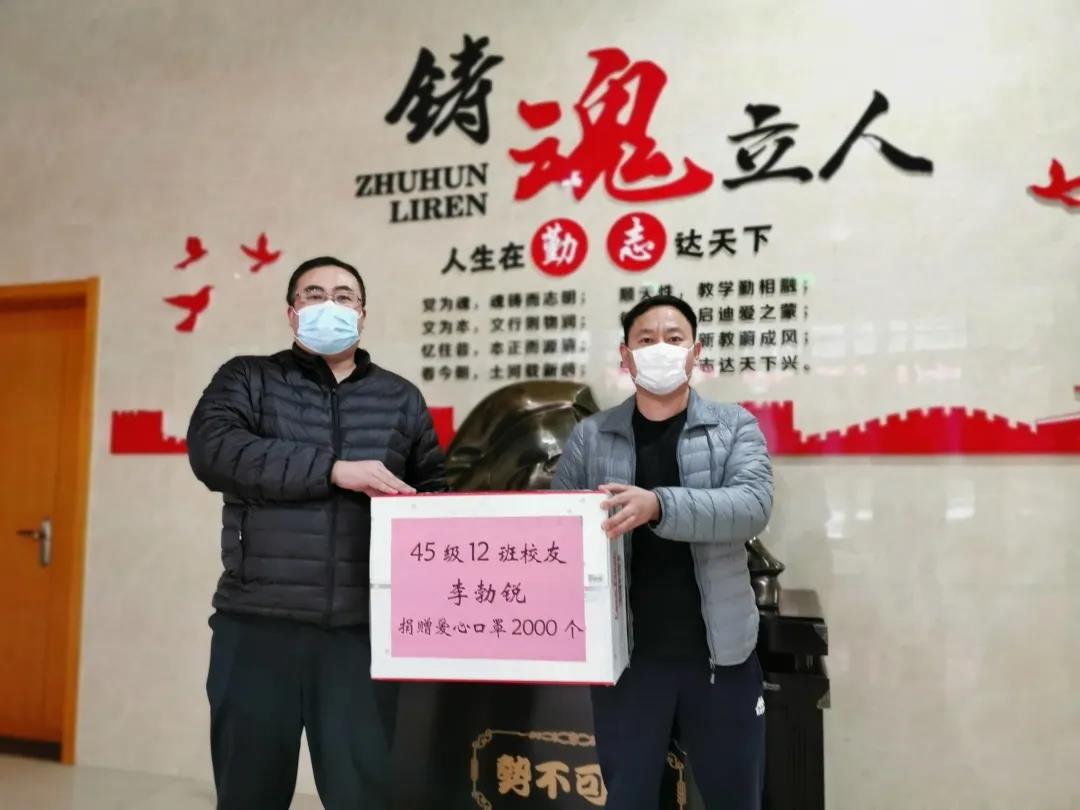 2月28日上午,我校校友、45级12班毕业生李勃锐给母校寄赠2000个口罩,李勃锐校友的两位高中老班阚静一老师和齐可鼎老师代表学校接收了捐赠。李勃锐说,新型冠状病毒感染的肺炎疫情牵动人心,学校老师肩负着育人使命和抗击疫情的双重重任,作为毕业多年的老学生,恩师们的健康平安是他一直的牵挂,疫情当下,他更愿意伸出援手为抗击疫情、护佑校园平安做出自己的一份贡献。
