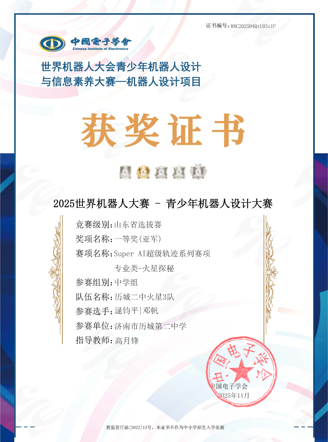 逯钧平,曾获世界机器人锦标赛小学组一等奖、全国中小学信息技术创新与实践大赛初中组一等奖、全国青少年人工智能创新挑战赛银奖、国家科技部“恩欧希教育信息化发明创新奖”等奖项。