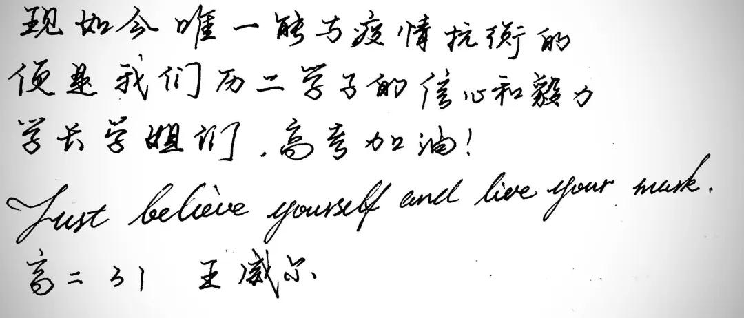 金榜题名,回报母校,是每个二中人的共同心愿。在高考日益临近之际,为给54级高三学子加油祝福,同时鼓舞高一高二学子将拼搏精神薪火相传,55级高二级部进行以“榜上有名,脚下有路——高三学长学姐我想对你说”为主题的为高三呐喊加油活动。同学们通过视频、手抄报等自己喜欢的方式,将心中想对学长学姐说的话表达出来,为他们送上祝福,共同期盼他们在今年的盛夏七月,能够马到成功,金榜题名!
