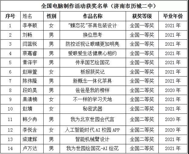 在本届比赛活动中,历城二中陈伟隆、刘畅、赵琳萱等14位选手的电脑作品入围全国赛,位居全国前列。经过主办单位(全国电脑活动组委会)组织的作品技术测试、网上公示、专家评选、作者面试(包括现场技术测试和学生答辩)等步骤产生并确定全国奖项等级。