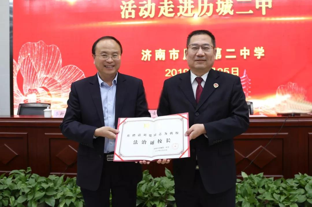 历城二中党委书记、校长李新生为刘建检察长颁发“法治副校长”聘书。