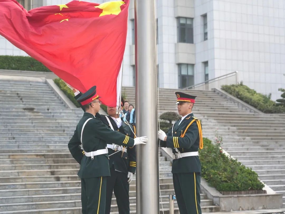 本次升旗仪式由高二2班主持。迎着晨曦,护旗手迈着整齐划一的步伐护送国旗至升旗台。随着国歌声奏响,全场肃立,鲜艳的五星红旗冉冉升起。
