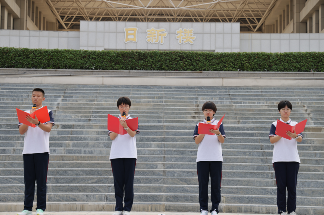 伴随着国歌声,国旗高高升起,全体师生跟随大声歌唱国歌。孙嘉蔓、苏茉尔、赵儒正和冯蕊四位同学进行《勿忘国耻 振兴中华》国旗下演讲。他们呼吁同学们铭记历史,铭记先辈们不屈的抗争,珍惜和平,将红色基因刻进骨子里、融入血液中、落到行动上。
