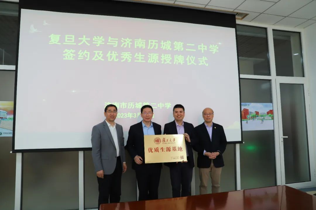 近日,复旦大学山东招生组负责人、化学系教授李巧伟,招生办主任、法学院教授潘伟杰一行来到历城二中授予我校“中学学术实践基地”和“优质生源基地”。历城二中执行校长李矿水、副校长岳善华参与授牌仪式。