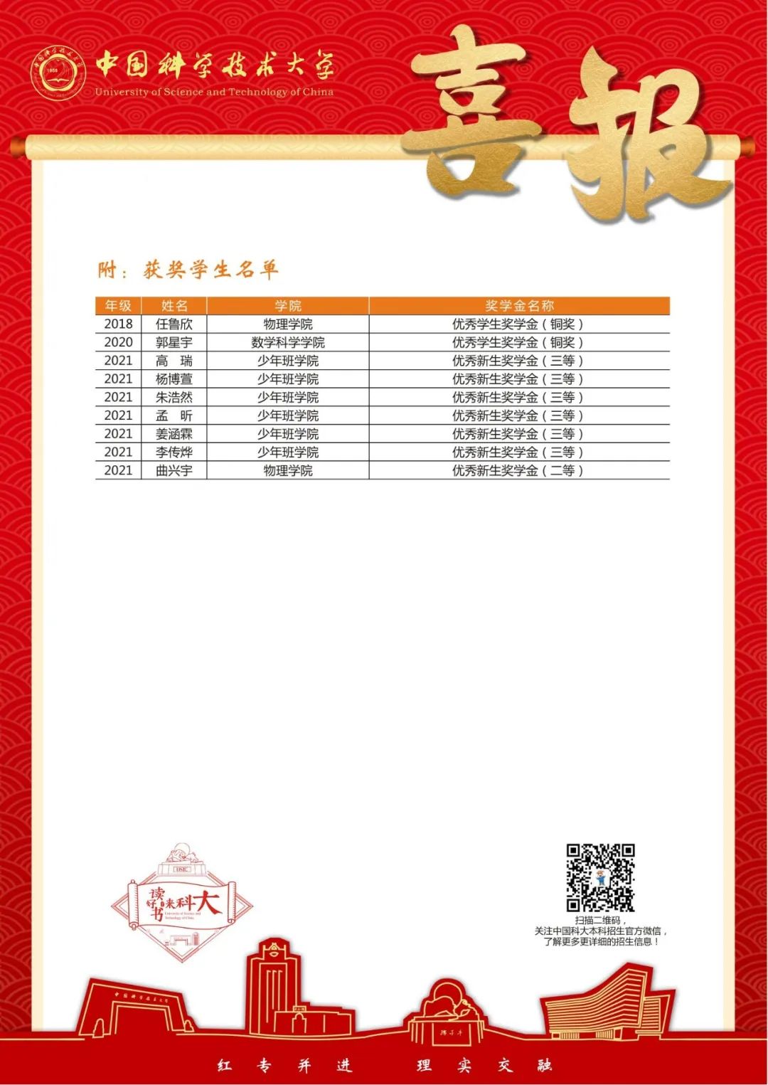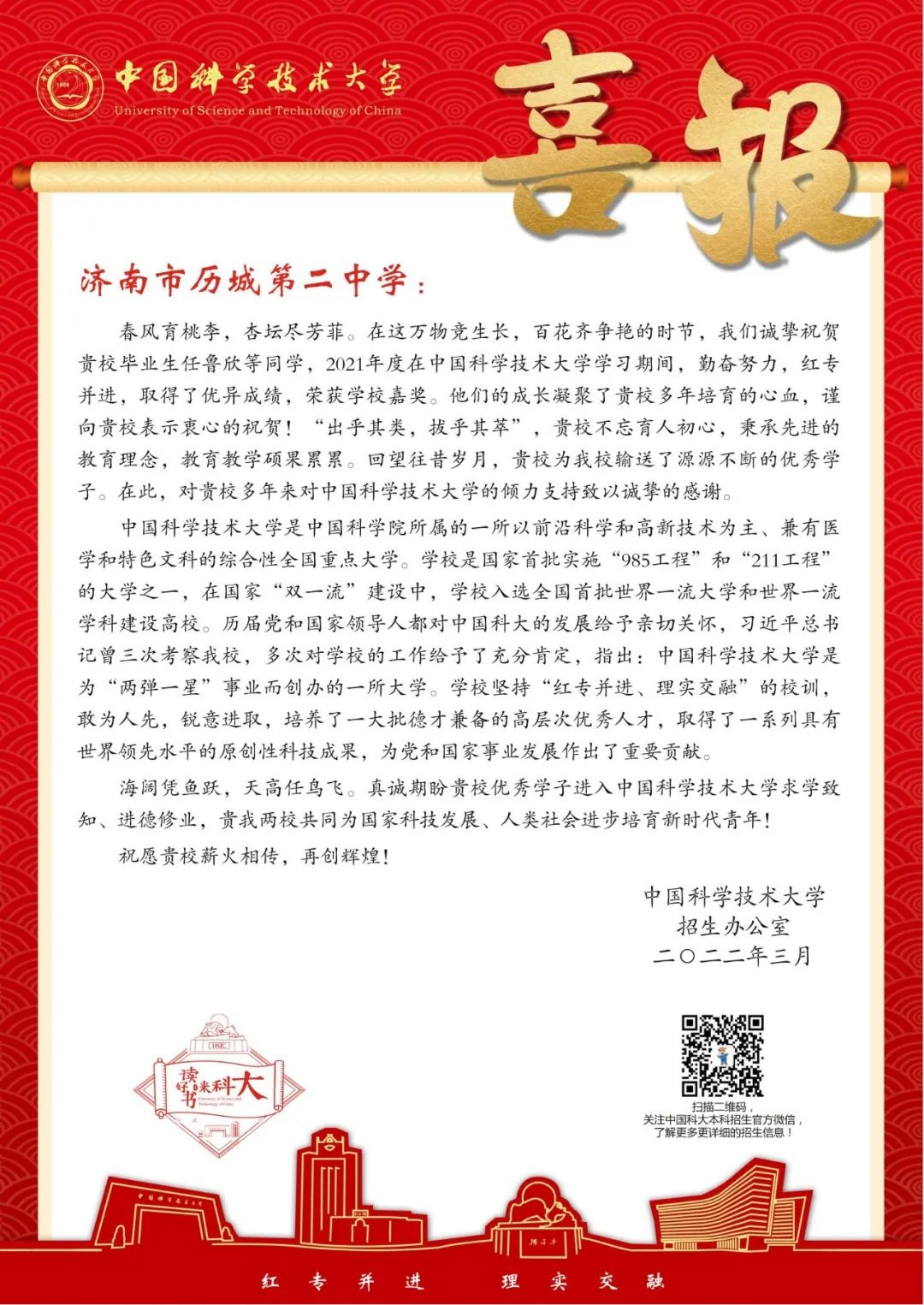 中国科学技术大学向我校报喜!