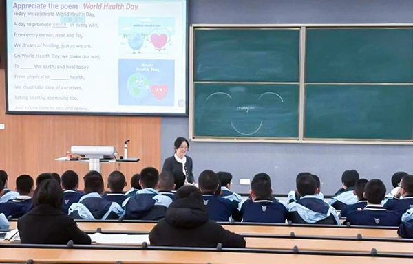 教师王琪以《诗行里的完形——健康生活的三重奏》为主题进行展示。她以“世界卫生日”诗歌为序章,铺展“追根溯源·拨云见日·云开雾散”的解题三部曲,在“健康生活”的主题语境中,将技巧浸润于诗性语言,让知识迁移如春风化雨。