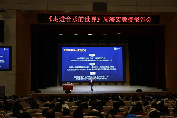 周海宏教授与大家分享了关于“音乐何需懂”“音乐理解何需正确”“联觉”等音乐心理理论,通过案例分析、音乐辨析等多种方式,告诉了大家“音乐怎么听”“艺术有啥用”“审美怎么教”,明确了目的指向“掌握音乐的美学原理”“揭示艺术的本质功能”“认识教育的基本原则”等,呈现了周海宏教授对音乐心理学的独特见解和学术思想,加之多年的音乐心得,从个人到社会,从音乐到教育,带领大家在音乐的世界中去享受生活、认识社会。