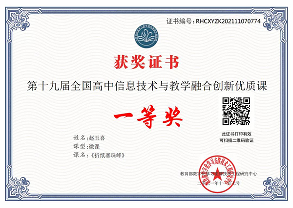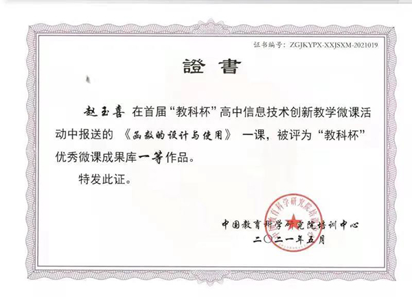 赵玉喜老师将信息编程教学与微课教学有机融合,探索信息化资源创新和使用的常态化、个性化、智能化,既促进自身专业素养的提升,又培养学生养成数字化学习环境下终身学习的良好习惯。自今年5月到11月,参与申报的三节微课经过公示、展评、答辩等环节均获全国奖。2021年5月“教科杯”微课《函数的设计与使用》全国一等奖,2021年9月微课《递归算法典型题讲解》获“深度融合探索成果”奖,2021年11月教育部数字化微课《折纸赛珠峰》全国一等奖。