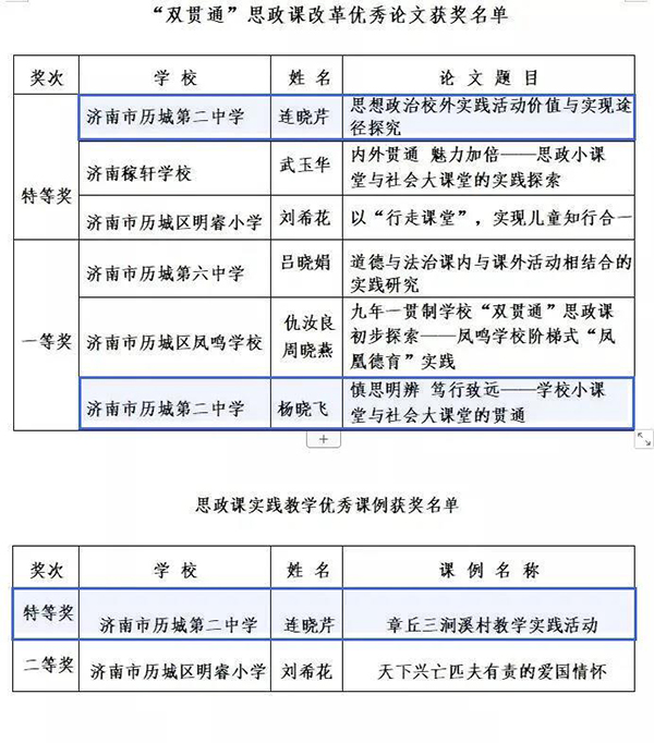 在“双贯通”思政课改革优秀论文评比活动中,连晓芹老师的论文《思想政治校外实践活动价值与实现途径探究》荣获特等奖、杨晓飞老师的论文《慎思明辨 笃行致远——学校小课堂与社会大课堂的贯通》荣获一等奖;在思政课实践教学优秀课例评比活动中,连晓芹老师《章丘三涧溪村教学实践活动》课例荣获特等奖;在济南市首届思政课教学设计大赛中,张治薇老师荣获特等奖。