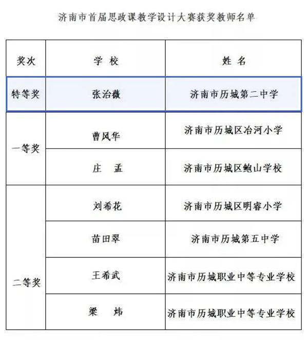 近日,济南市教育局下发了《关于公布济南市首届思政课教学设计大赛获奖教师名单的通知》、《关于公布济南市“双贯通”思政课改革优秀成果名单的通知》,历城二中连晓芹、杨晓飞、张治薇三位教师获奖,其中,连晓芹老师斩获两项特等奖。