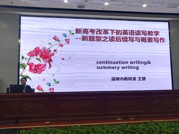 会议邀请了淄博教研室高中英语教研员王慧老师做了主题为《新高考改革下的英语读写教学——新题型之读后续写与概要写作》的报告,潘广东老师主持了此次研讨活动。
