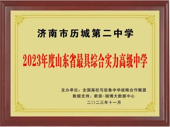 日前,2023年度山东中学教育盛典荣耀榜单盛大发布, 济南市历城第二中学荣获“2023年度山东省最具综合实力高级中学”奖项。