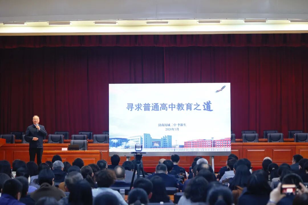 李新生书记以《寻求普通高中教育之道》为题,向天桥区教育体育局及区属中小学幼儿园的领导干部、校(园)长、书记等作专题讲座。他结合历城二中深耕基础教育近七十年的办学实践,系统介绍了学校以“勤志文化”为引领,打造英才教育、科创教育、艺体教育“三大名片”,构建多元育人体系,致力于为每一位学生搭建成长阶梯的探索经验与办学成果。