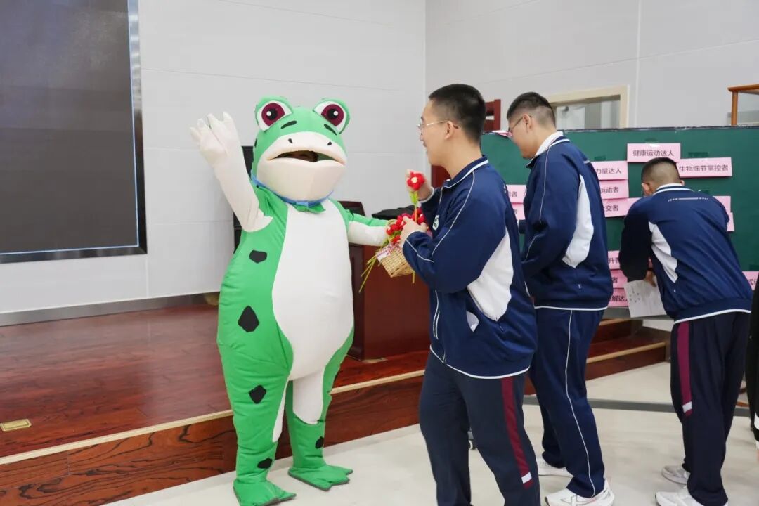 可爱的“青蛙王子”版胡老师——惊喜出现了:穿上人偶服的胡老师,为每一位撕掉旧标签、迎向新标签的学子,亲手送上了一朵小红花!