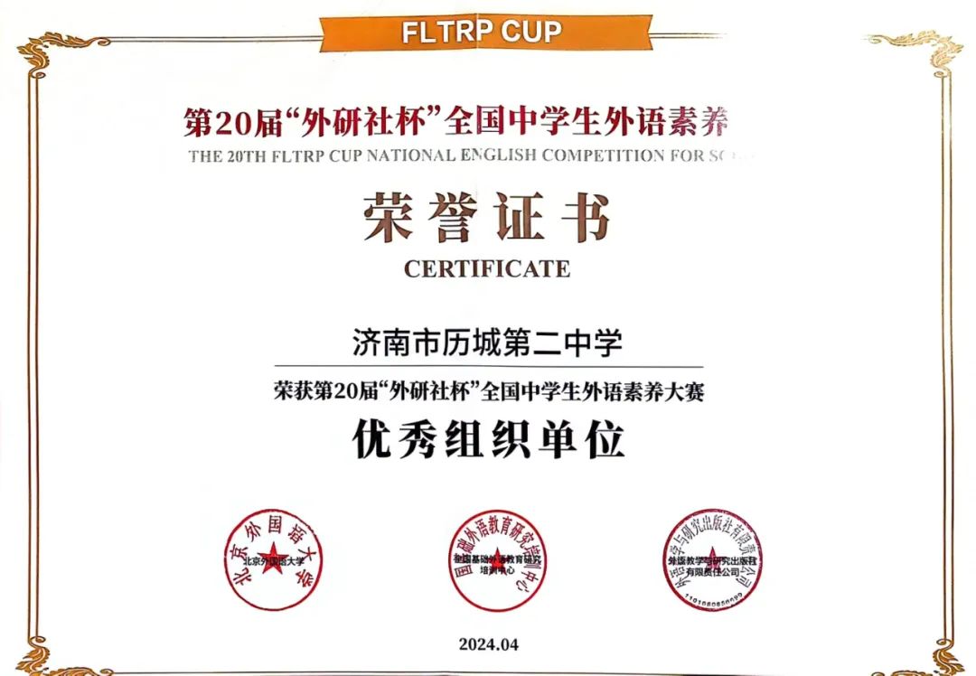 在第20届“外研社杯”全国中学生外语素养大赛中,历城二中学子喜获佳绩!学校获评“优秀组织奖”,226人获省级以上荣誉,其中,高二7班孙易如更是在全国近百万名参赛选手中脱颖而出,成为济南市晋级决赛的四位选手之一,成功晋级全国百强。