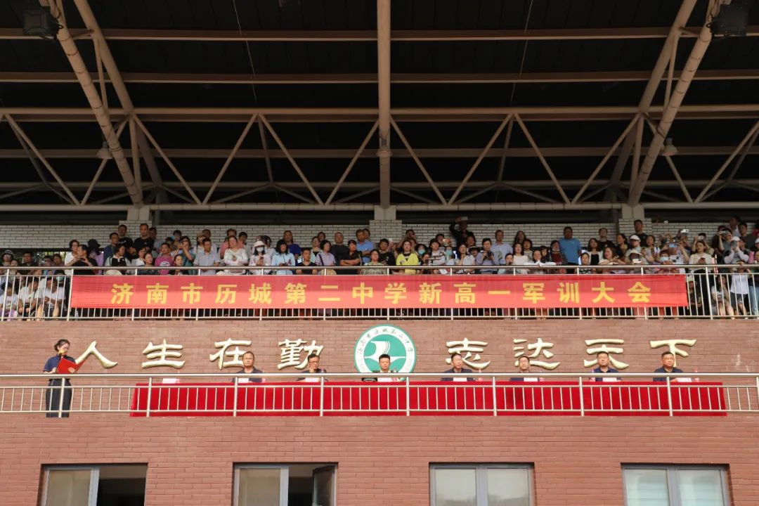 历城二中党委副书记李玉华讲话,他祝愿同学们满载军训的收获,秉承二中“人生在勤 志达天下”的校训,在未来的高中三年甚至更长的人生路上,乘风破浪,直挂云帆!