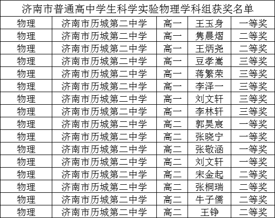 近日,济南市教育教学研究院公布济南市普通高中学生科学实验比赛结果,济南市历城第二中学喜得佳绩,45位同学在物理、生物、化学学科组实验中分获一、二、三等奖。其中,物理学科组有16人获奖,化学学科组有15人获奖,生物学科组有14人获奖。