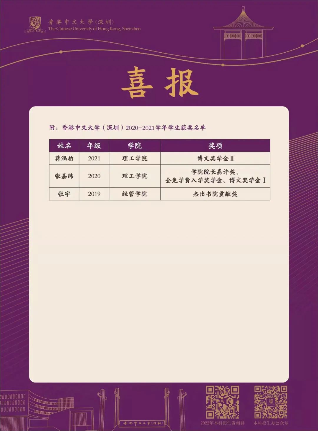 万木峥嵘,繁花似锦。值此佳时,香港中文大学(深圳)向我校发来喜报,祝贺我校优秀毕业生蒋涵柏获得博文奖学金Ⅱ,张嘉纬获得学院院长嘉许奖、全免学费入学奖学金和博文奖学金Ⅰ,张宇获得杰出书院贡献奖。