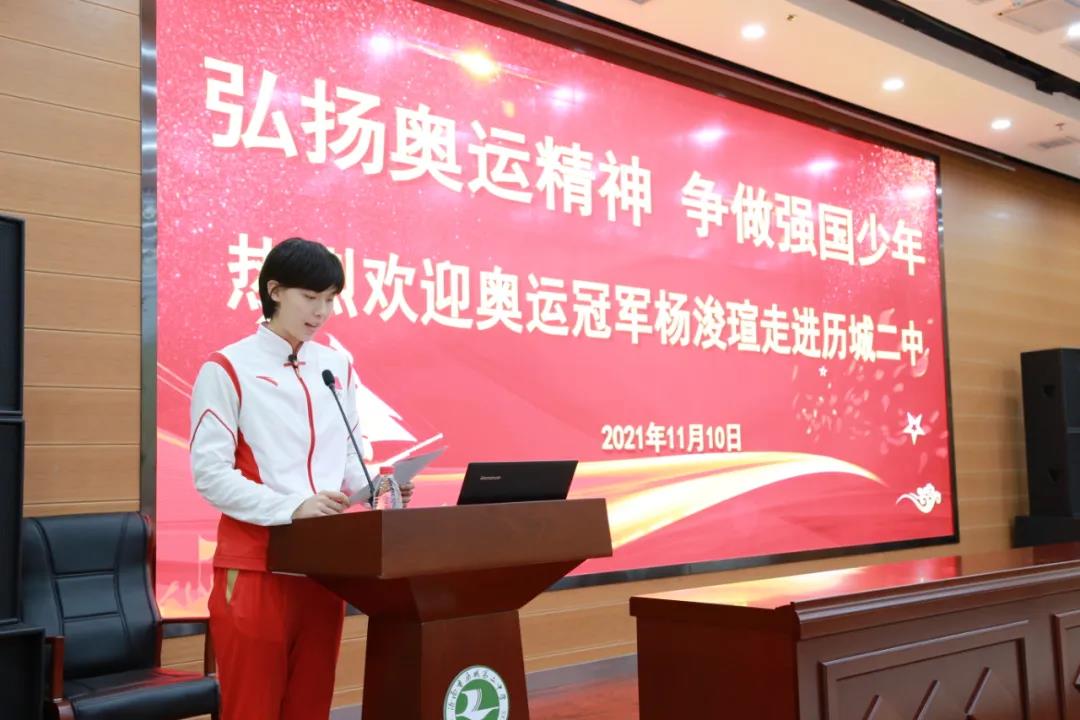 这是山东省游泳中心携东京奥运会冠军杨浚瑄一行走进历城二中进行宣讲系列活动的一个片段。11月10日下午,杨浚瑄在日新楼报告厅为同学们带来了一场精彩的报告。山东省游泳运动管理中心副主任顾晓琳,山东省游泳运动管理中心竞训科长、游泳队领队陈洋,历城二中执行校长李矿水、副校长岳善华,以及体育教练员,足球、篮球队员和部分奥赛学生参加活动。活动由学校团委副书记王宴明主持。
