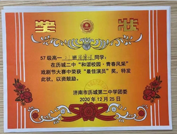 曾参与学校组织的话剧比赛。因为全心全意,贯注真情实感,赢得了同学们的认可,获得了最佳演员的称誉。