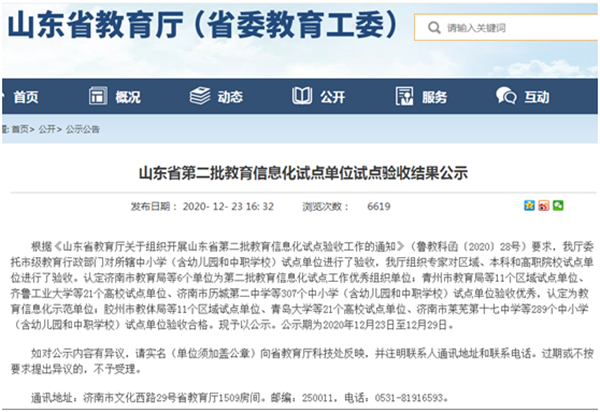 根据《山东省教育厅关于组织开展山东省第二批教育信息化试点验收工作的通知》(鲁教科函〔2020〕28号)要求,山东省教育厅委托市级教育行政部门对所辖中小学(含幼儿园和中职学校)试点单位进行了验收,历城二中验收结果为优秀等级,被认定为山东省教育信息化示范单位。