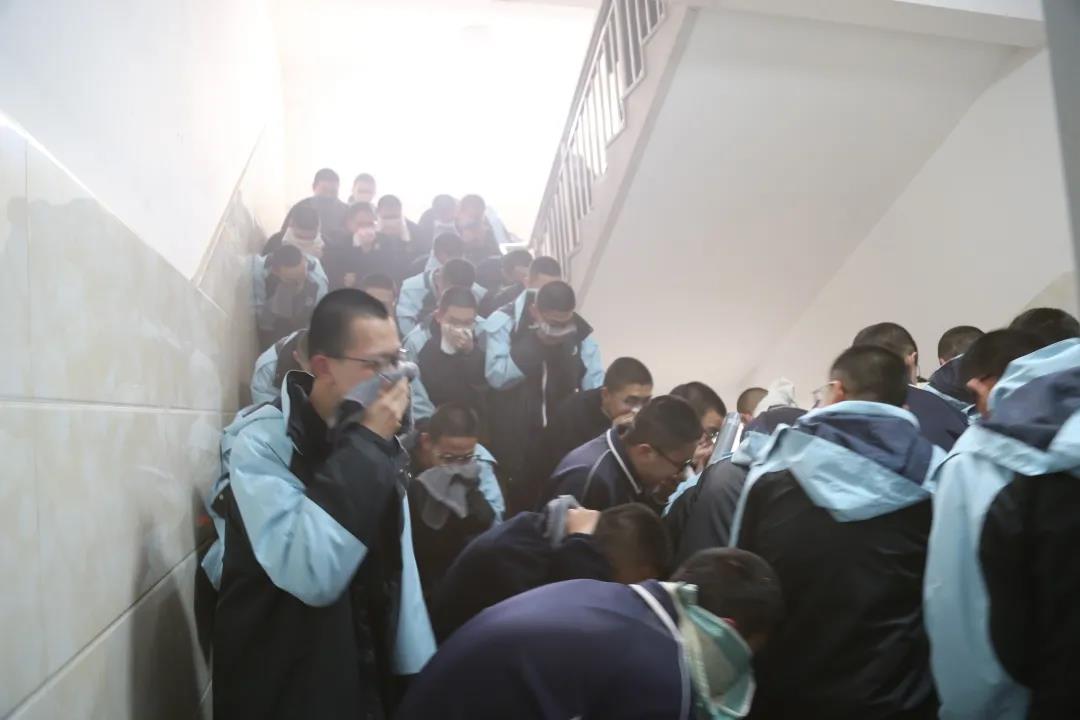 同学们用湿毛巾捂住口鼻,弯腰低头,在老师们的引导下沿疏散楼梯有序疏散离开宿舍楼。同学们认真对待演习,不慌张不嬉闹,按指挥有序到达舜德广场等室外安全地区。