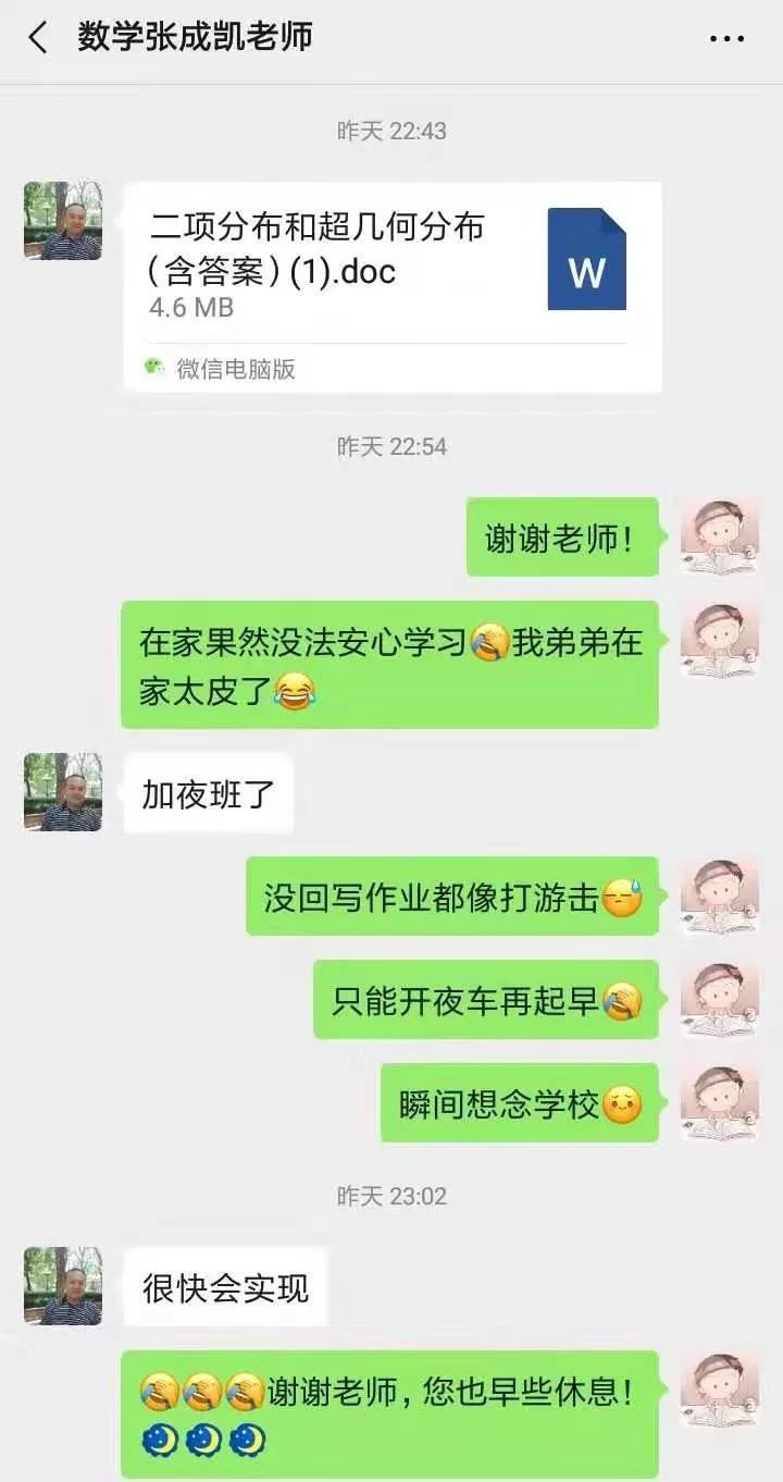 通过张老师在学习群里的激励和指导,学生们学习数学的积极性大大提高。有的学生在夜里11点,还给张老师发来作业,向张老师请教问题,张老师也都一一耐心地予以点拨和肯定。