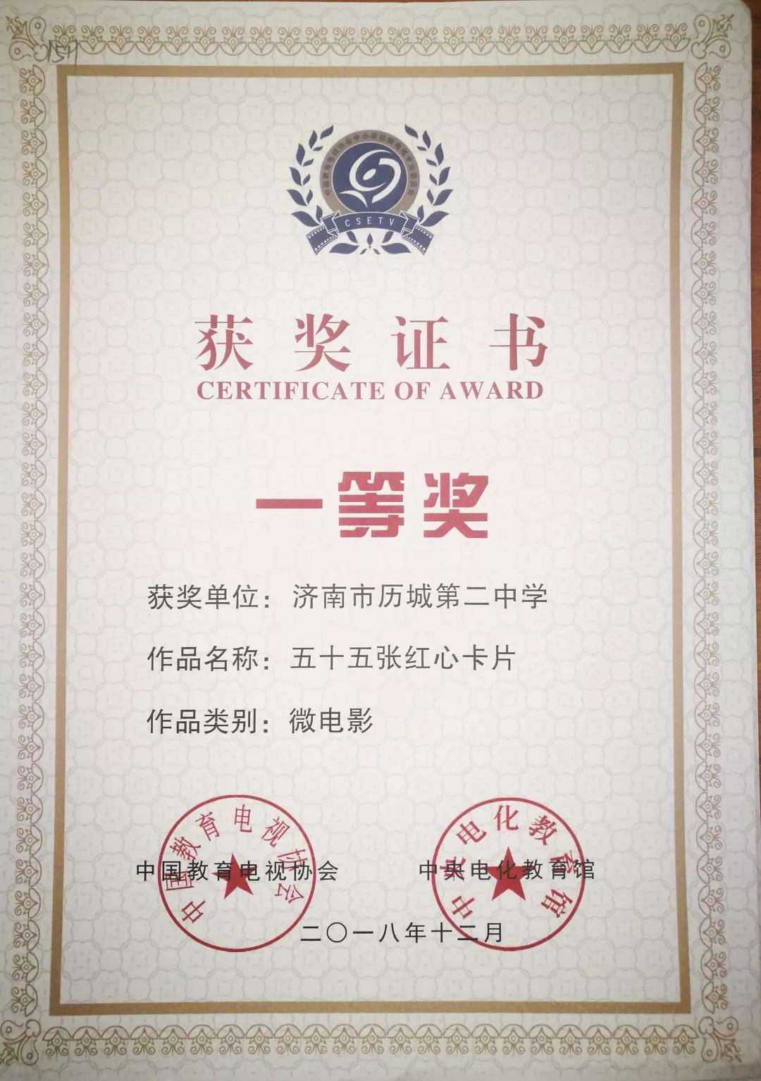 由中央电教馆主办的第十五届全国校园影视大赛于2018年12月落下帷幕,我校电视台社团制作的微电影《五十五张红心卡片》和《以己之名》获得大赛微电影类一等奖。