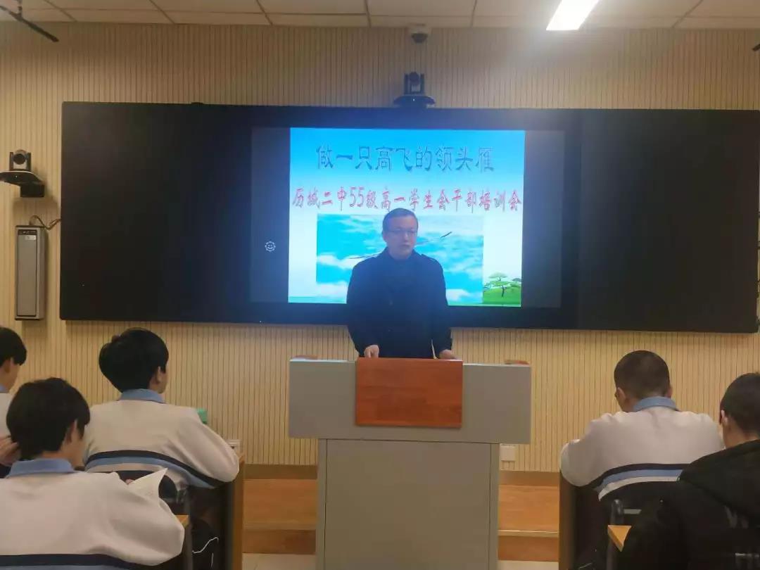 学生干部队伍建设是学生工作的重要组成部分,为进一步提升学生核心素养和服务意识,1月3日晚,历城二中55级高一级部召开了主题为“做一只高飞的领头雁”的学生干部培训会。各班班长、团支书和学生会全体成员参加培训会。陈国强副校长和张海光副主任到会主讲。