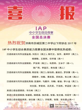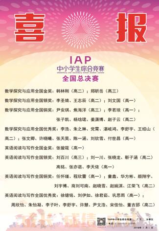 近日,在第十届IAP中小学生综合素质能力竞赛全国总决赛中,我校参赛选手在汉语阅读与写作、英语口语、英语阅读和写作以及数学探究与应用领域表现突出,成绩优异,其中54级王泰然同学获得汉语阅读与写作全国单科状元。
