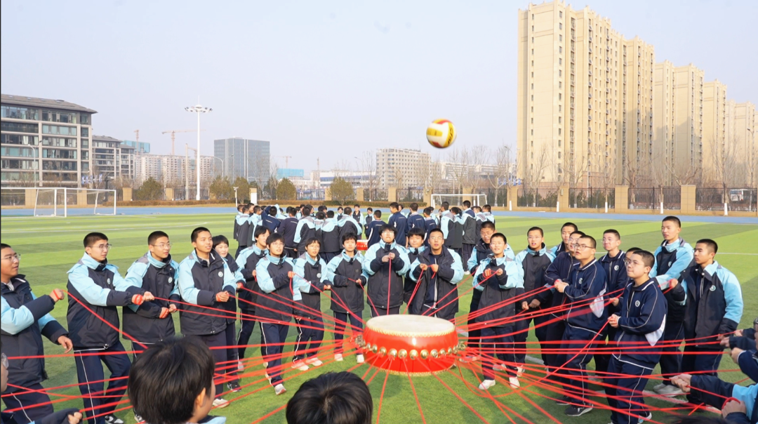操场的另一边,鼓面被同学们拉得紧绷,排球在鼓上蹦跳翻飞。十几双手各握鼓绳,紧盯排球、调整力道,动作在协作中愈发同步。计数声、鼓点声、欢呼声交织成奋进的乐章,格外响亮,一群人心往一处想、劲往一处使,用同心协作,将零散动作汇成共赢的默契。