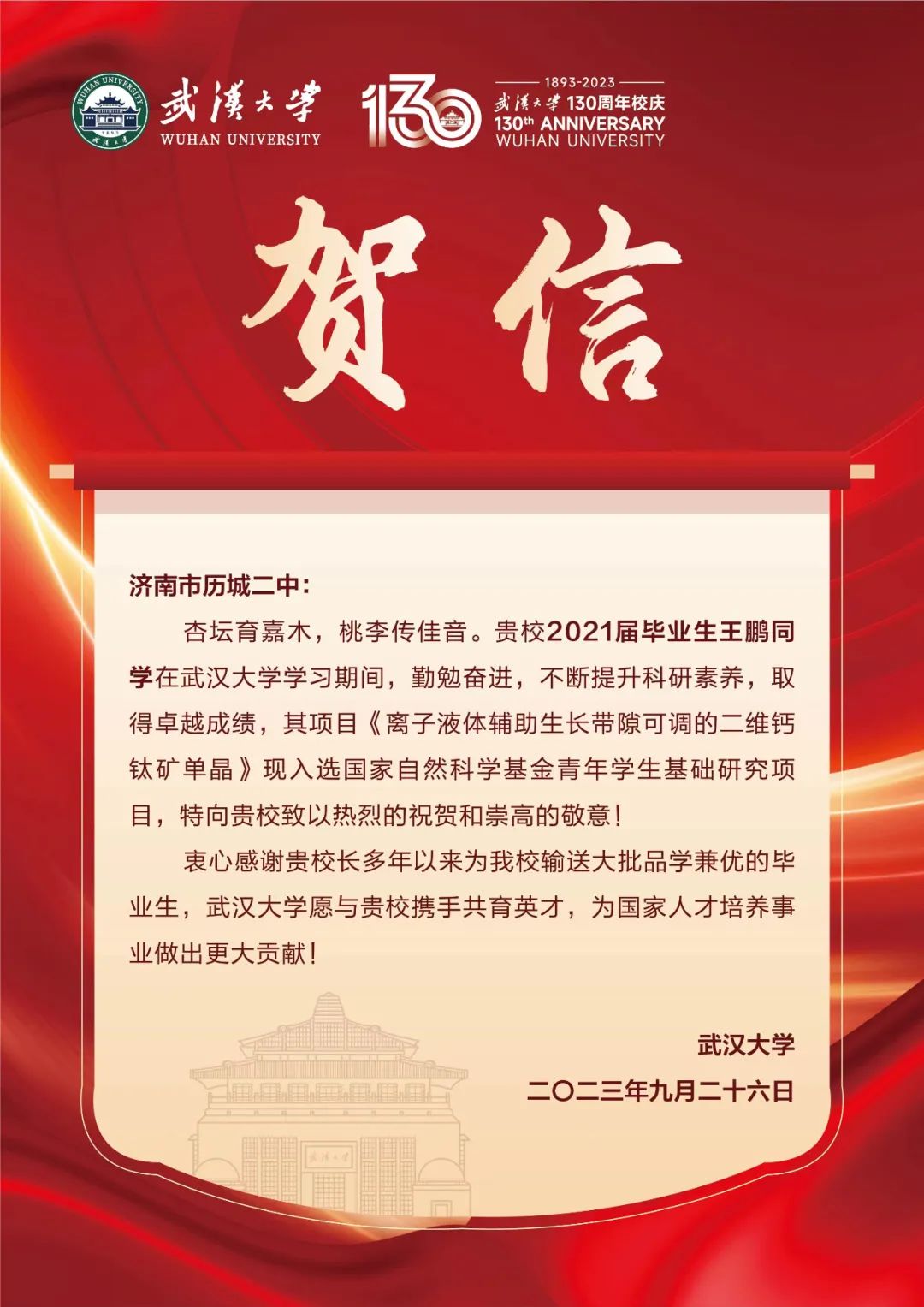 9月,一份喜讯传来,历城二中55级毕业生王鹏所研项目《离子液体辅助生长带隙可调的二维钙钛矿单晶》入选国家自然科学基金青年学生基础研究项目。