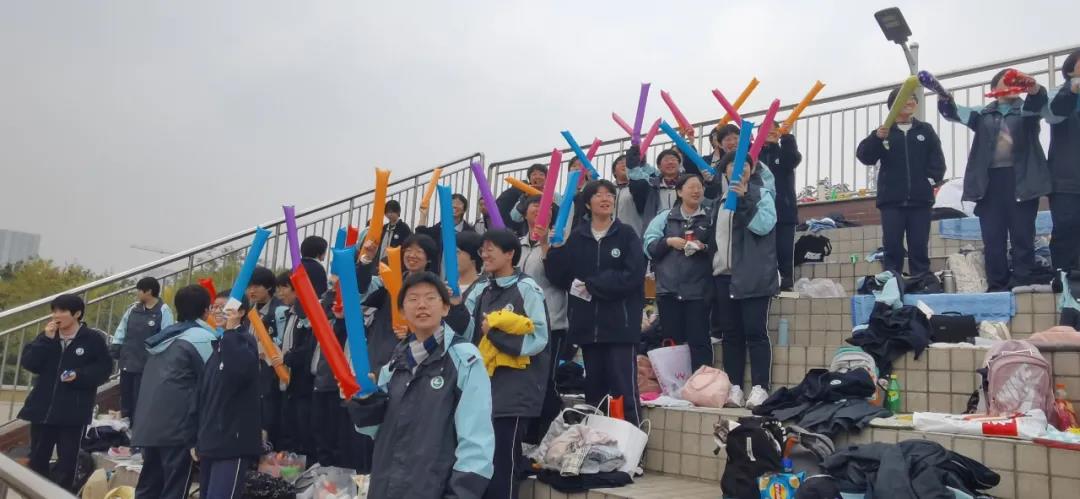 在拼搏奋进中,温情也从不缺席。场后有身穿玩偶服的志愿者为同学们增添快乐;
