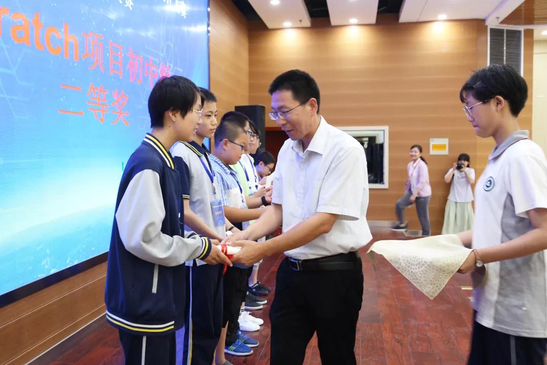 历城二中副校长李矿水在仪式上发言,他首先感谢山东省科学技术协会为学校搭建了这个相聚和学习的平台,我校将借大赛东风,进一步开展普及编程知识、推广智能设计技能的科普活动,促进学生健康全面发展。出席活动的嘉宾为获奖选手颁奖,预祝代表山东省参加国赛的选手们取得更加优异的成绩。